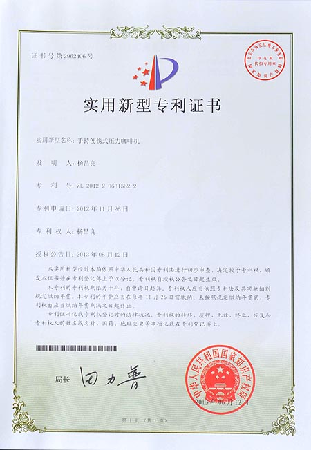 手持便携式压力咖啡机专利证书