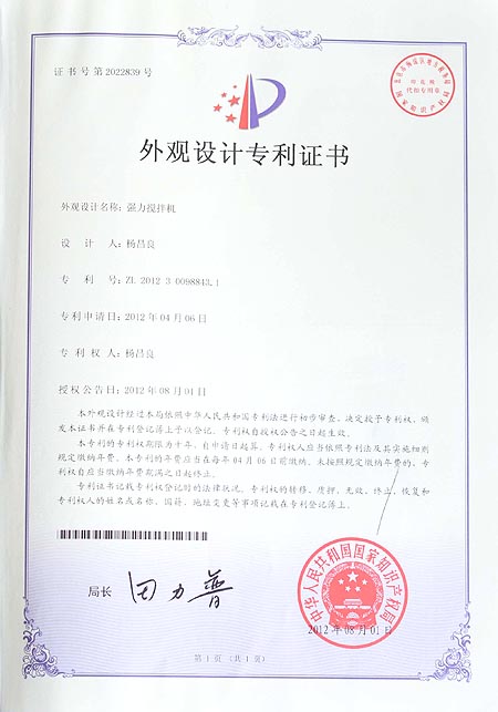 强力搅拌机外观设计专利证书