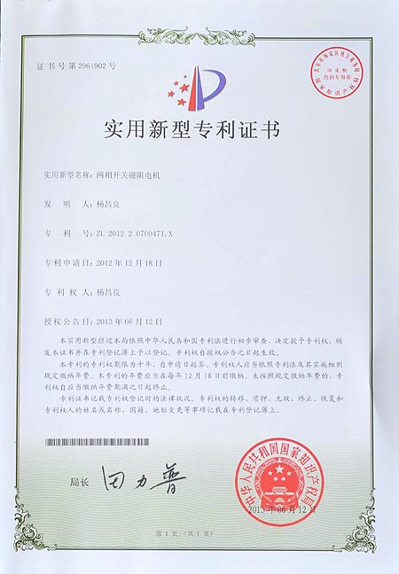 两相开关磁阻电机专利证书