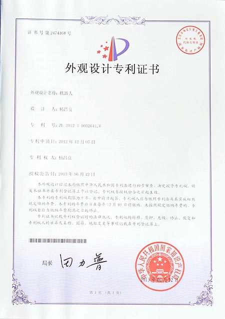 机器人外观设计专利证书