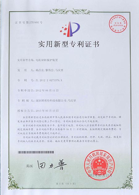 电机堵转保护装置专利证书