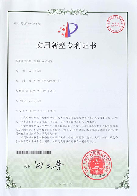 饮水机发热装置专利证书