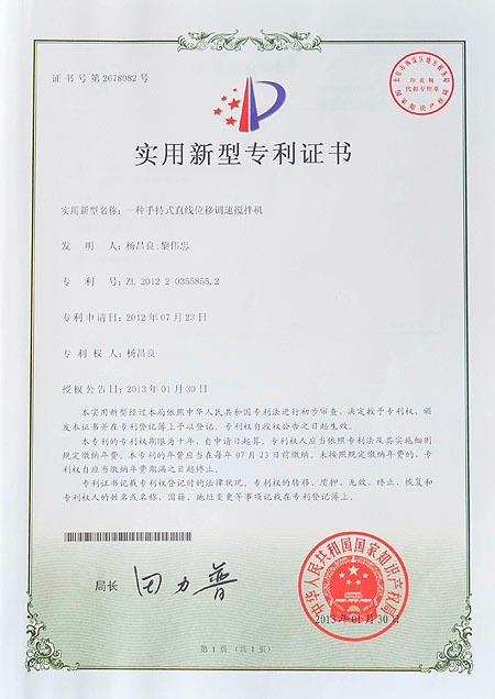 一种手持式直线位移调速搅拌机专利证...
