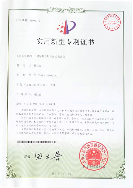 小型加热器用管体式发热体专利证书